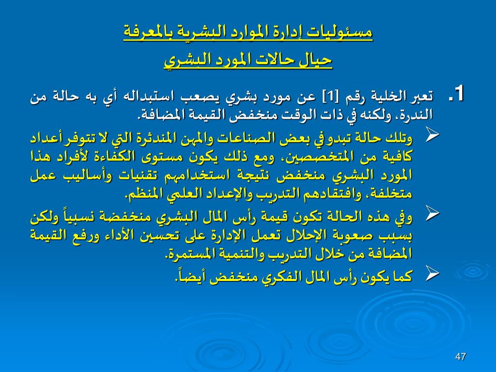 مسئوليات إدارة الموارد البشرية بالمعرفة حيال حالات المورد البشري • تعبر الخلية رقم [1] عن مورد بشري يصعب استبداله أي به حالة من الندرة، ولكنه في ذات الوقت منخفض القيمة المضافة. • وتلك حالة تبدو في بعض الصناعات والمهن المندثرة التي لا تتوفر أعداد كافية من المتخصصين، ومع ذلك يكون مستوى الكفاءة لأفراد هذا المورد البشري منخفض نتيجة استخدامهم تقنيات وأساليب عمل متخلفة، وافتقادهم التدريب والإعداد العلمي المنظم. • وفي هذه الحالة تكون قيمة رأس المال البشري منخفضة نسبياً ولكن بسبب صعوبة الإحلال تعمل الإدارة على تحسين الأداء ورفع القيمة المضافة من خلال التدريب والتنمية المستمرة. • كما يكون رأس المال الفكري منخفض أيضاً.