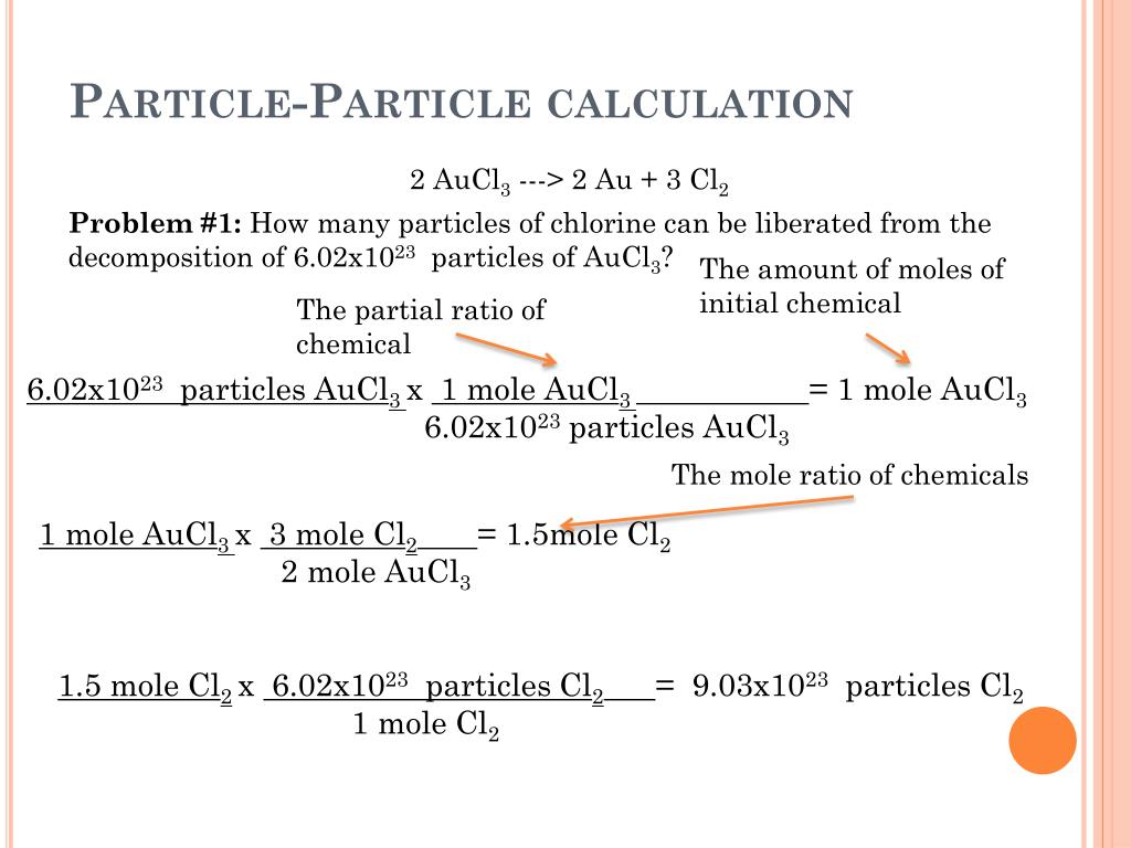 2 AuCl3 ---> 2 Au + 3 Cl2 Problem #2:How many particles of chlorine can be liberated from the decomposition of 150. particles of AuCl3? 150. particles AuCl3 x 1 mole AuCl3 = 2.492x10-22 mole AuCl3 6.02x1023 particles AuCl3 2.492x10-22 mole AuCl3 x 3 mole Cl2= 3.738x10-22 mole Cl2 2 mole AuCl3 3.738x10-22 mole Cl2x 6.02x1023 particles Cl2= 225 particles Cl2 1 mole Cl2