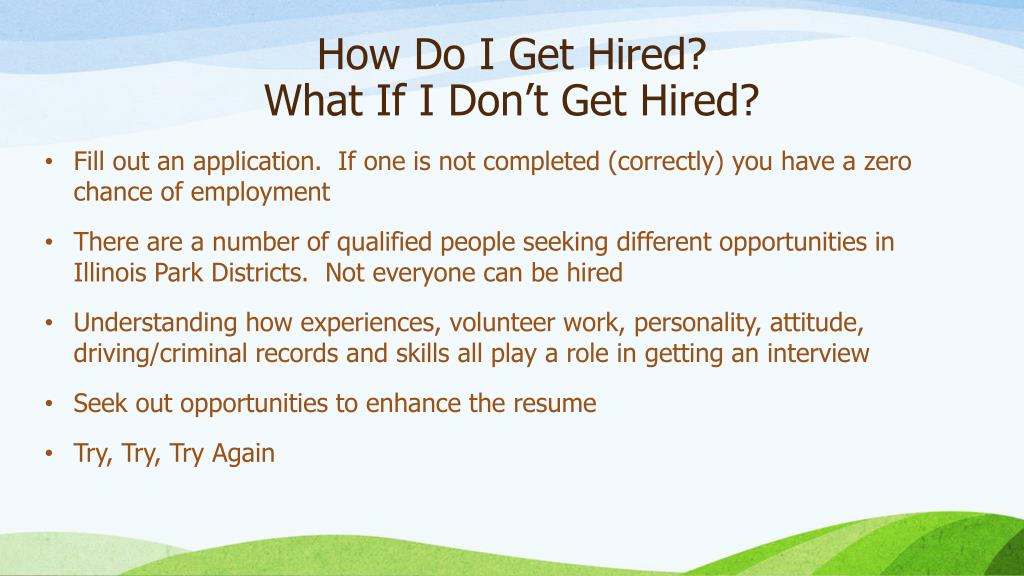 How Do I Get Hired? What If I Don’t Get Hired? • Fill out an application. If one is not completed (correctly) you have a zero chance of employment • There are a number of qualified people seeking different opportunities in Illinois Park Districts. Not everyone can be hired • Understanding how experiences, volunteer work, personality, attitude, driving/criminal records and skills all play a role in getting an interview • Seek out opportunities to enhance the resume • Try, Try, Try Again