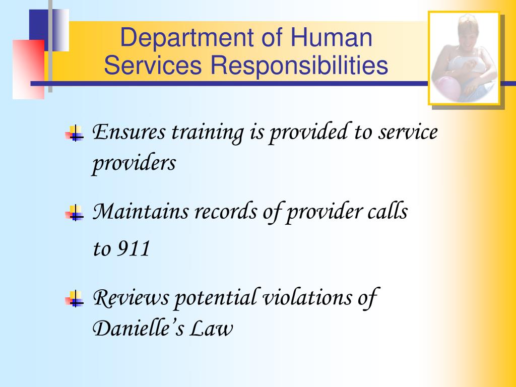 Department of Human Services Responsibilities • Ensures training is provided to service providers • Maintains records of provider calls to 911 • Reviews potential violations of Danielle’s Law