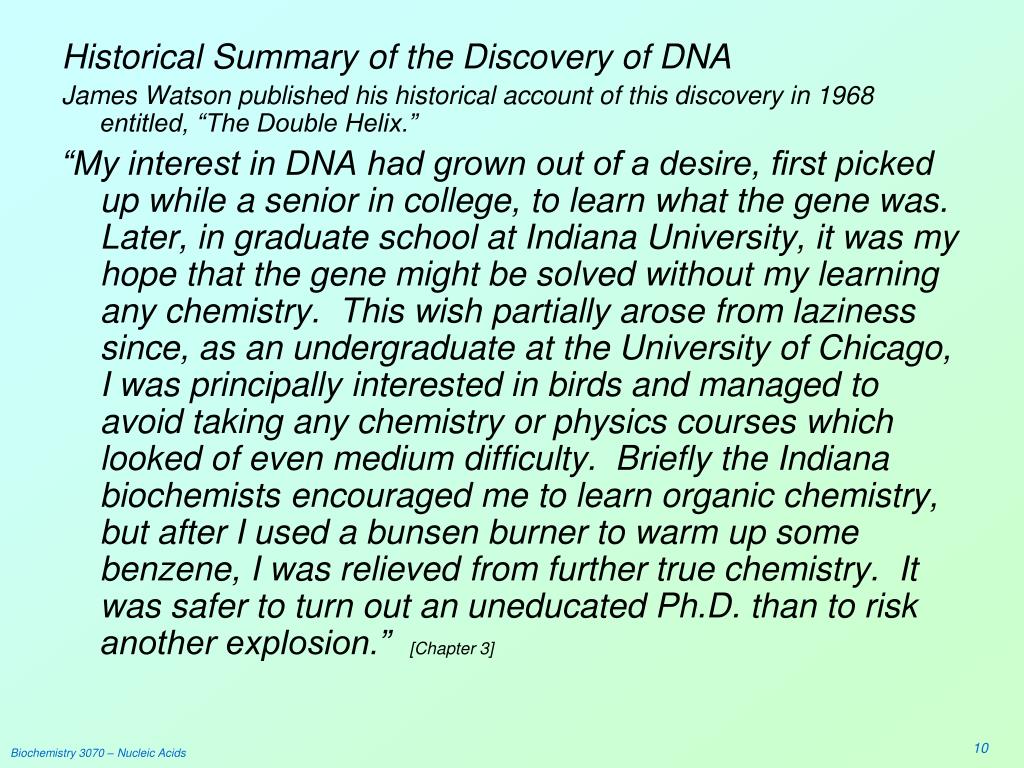 Historical Summary of the Discovery of DNA James Watson published his historical account of this discovery in 1968 entitled, “The Double Helix.” “My interest in DNA had grown out of a desire, first picked up while a senior in college, to learn what the gene was. Later, in graduate school at Indiana University, it was my hope that the gene might be solved without my learning any chemistry. This wish partially arose from laziness since, as an undergraduate at the University of Chicago, I was principally interested in birds and managed to avoid taking any chemistry or physics courses which looked of even medium difficulty. Briefly the Indiana biochemists encouraged me to learn organic chemistry, but after I used a bunsen burner to warm up some benzene, I was relieved from further true chemistry. It was safer to turn out an uneducated Ph.D. than to risk another explosion.”[Chapter 3] Biochemistry 3070 – Nucleic Acids