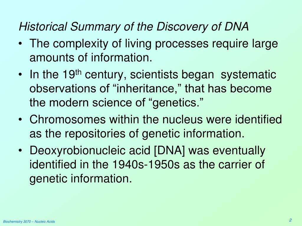 Biochemistry 3070. Nucleic Acids. Historical Summary of the Discovery of DNA The complexity of living processes require large amounts of information. In the 19 th century, scientists began systematic observations of “inheritance,” that has become the modern science of “genetics.”