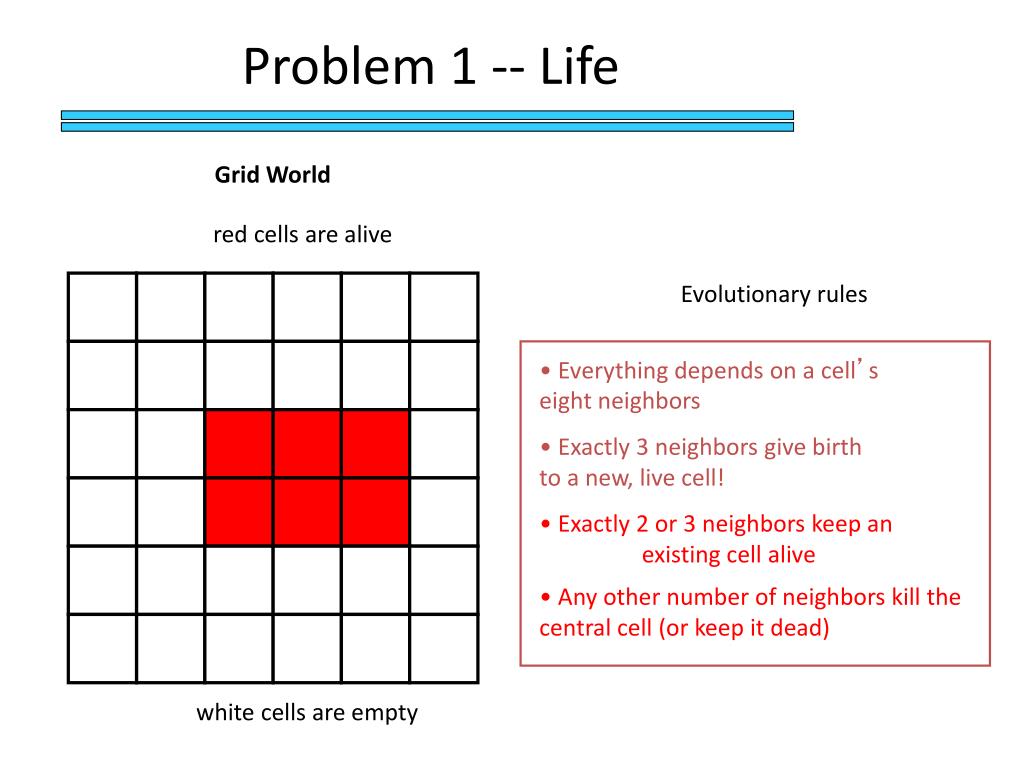 Problem 1 -- “Life” Grid World red cells are alive Evolutionary rules • Everything depends on a cell’s eight neighbors • Exactly 3 neighbors give birth to a new, live cell! • Exactly 2 or 3 neighbors keep an existing cell alive • Any other number of neighbors kill the central cell (or keep it dead) white cells are empty