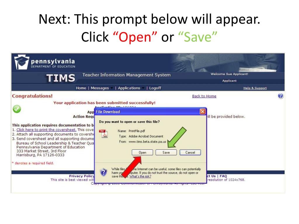 The Coversheet Explained“Taken from PDE Applicant User Guide” • IMPORTANT NOTE: A two page document will open in PDF format. Review BOTH pages of the document as it provides detailed instructions for submitting required documentation.It is important that you read and follow all directions closely as this will help ensure that your application is processed as quickly as possible. Providing the cover sheet, which includes bar codes are used to identify and process your application within TIMS. • You may save and print this document from the PDF file. Refer to screenshot of the second page of cover sheet document on slide 14. By saving the document to your hard drive you can print the document later or send it electronically to a PK‐12 Educational Entity or an Approved Educator Preparation Program if necessary. You will be required to submit it to PDE along with the documentation required. You may return to TIMS and print the cover sheet from your dashboard also.