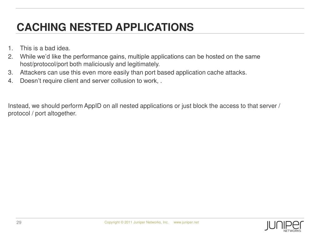 Caching Nested Applications • This is a bad idea. • While we’d like the performance gains, multiple applications can be hosted on the same host/protocol/port both maliciously and legitimately. • Attackers can use this even more easily than port based application cache attacks. • Doesn’t require client and server collusion to work, . Instead, we should perform AppID on all nested applications or just block the access to that server / protocol / port altogether.