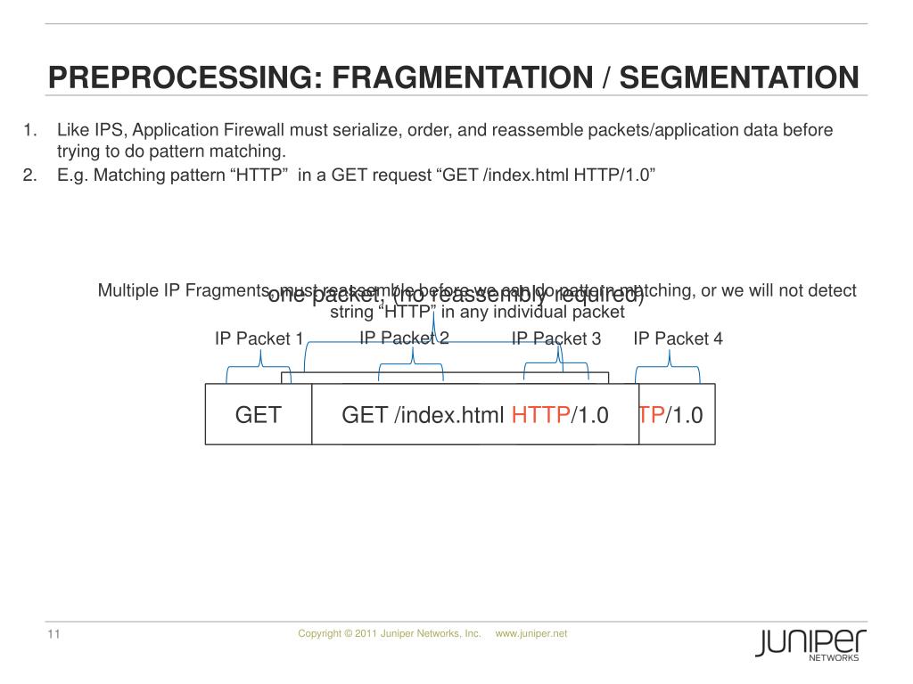 Preprocessing: Fragmentation / Segmentation • Like IPS, Application Firewall must serialize, order, and reassemble packets/application data before trying to do pattern matching. • E.g. Matching pattern “HTTP” in a GET request “GET /index.html HTTP/1.0” Multiple IP Fragments, must reassemble before we can do pattern matching, or we will not detect string “HTTP” in any individual packet one packet, (no reassembly required) IP Packet 2 IP Packet 1 IP Packet 3 IP Packet 4 GET /index.html HTTP/1.0 HT TP/1.0 GET GET /index.html HTTP/1.0 /index.html