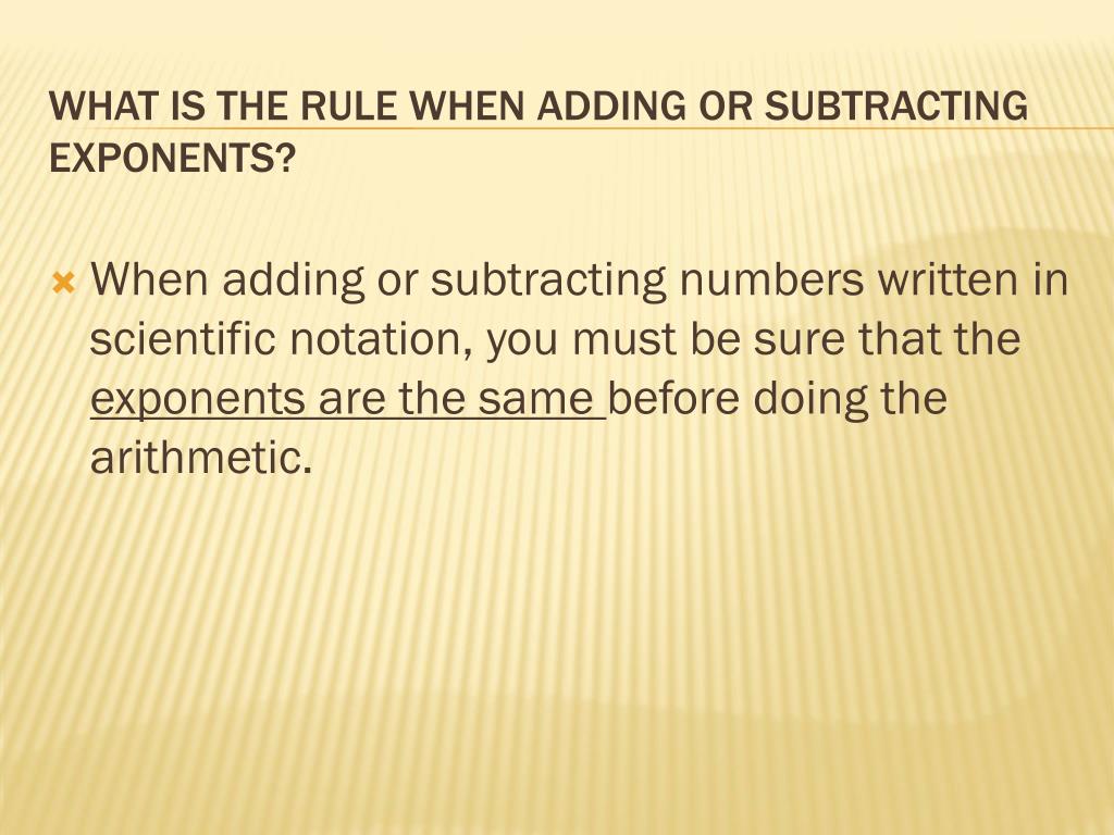 When adding or subtracting numbers written in scientific notation, you must be sure that the exponents are the same before doing the arithmetic. What is the rule when adding or subtracting exponents?
