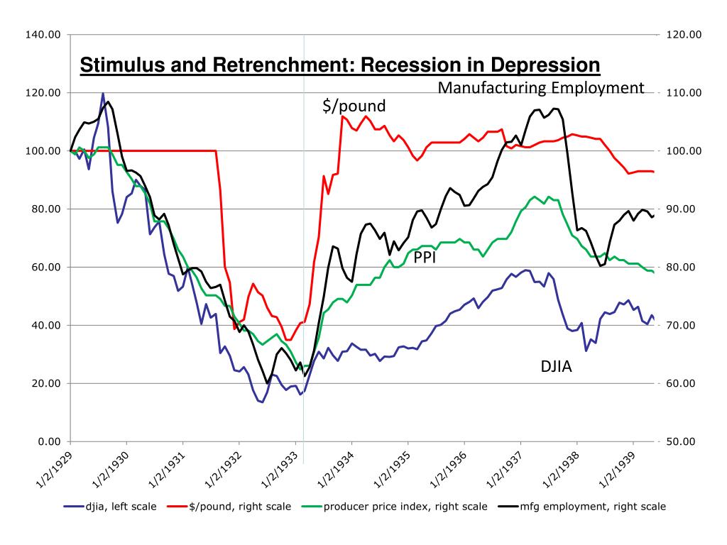 Onset of the Depression: Persistent Deflation…Persistent Job Loss Manufacturing Employment $/pound DJIA