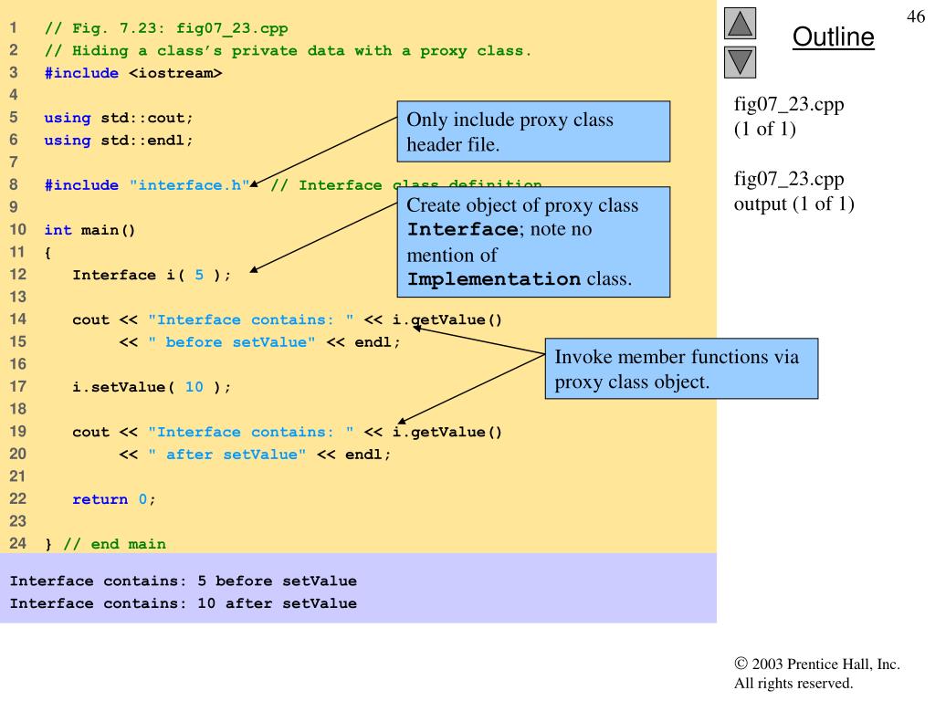 1 // Fig. 7.23: fig07_23.cpp 2 // Hiding a class’s private data with a proxy class. 3 #include <iostream> 4 5 using std::cout; 6 using std::endl; 7 8 #include"interface.h" // Interface class definition 9 10 int main() 11 { 12 Interface i( 5 ); 13 14 cout << "Interface contains: " << i.getValue() 15 << " before setValue" << endl; 16 17 i.setValue( 10 ); 18 19 cout << "Interface contains: " << i.getValue() 20 << " after setValue" << endl; 21 22 return0; 23 24 } // end main Only include proxy class header file. Create object of proxy class Interface; note no mention of Implementation class. Invoke member functions via proxy class object. fig07_23.cpp(1 of 1)fig07_23.cppoutput (1 of 1) Interface contains: 5 before setValue Interface contains: 10 after setValue