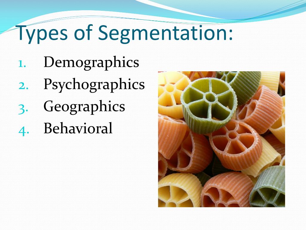Types of Segmentation: • Demographics • Psychographics • Geographics • Behavioral