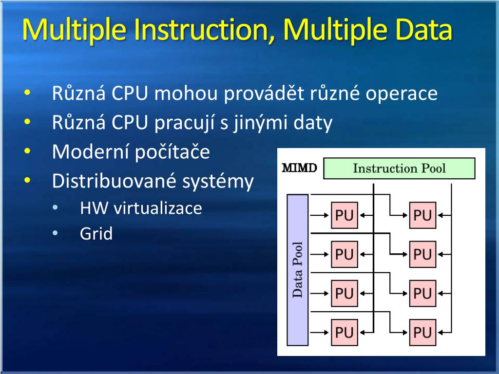 MultipleInstruction, MultipleData • Různá CPU mohou provádět různé operace • Různá CPU pracují s jinými daty • Moderní počítače • Distribuované systémy • HW virtualizace • Grid