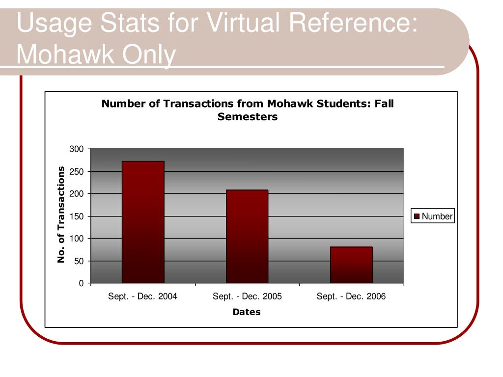 Background: Virtual Reference Services • Consortium with Algonquin , GBC, Seneca, St. Clair. • Use Tutor.com software (formerly LSSI) • Platform changed in Summer, 2006. • Hours: 10am – 9pm M-F, 8:30am – 5pm S&S • Hours are shared across all colleges. • Marketing: student newspaper,, Library homepage, icons throughout web site, class visits • Staffed by reference desk person at non-busy desk (at Mohawk)