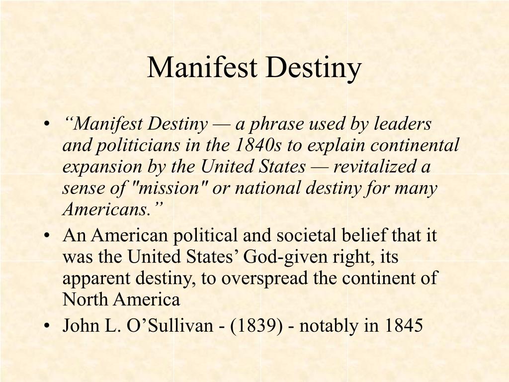 Manifest Destiny • “Manifest Destiny — a phrase used by leaders and politicians in the 1840s to explain continental expansion by the United States — revitalized a sense of "mission" or national destiny for many Americans.” • An American political and societal belief that it was the United States’ God-given right, its apparent destiny, to overspread the continent of North America • John L. O’Sullivan - (1839) - notably in 1845