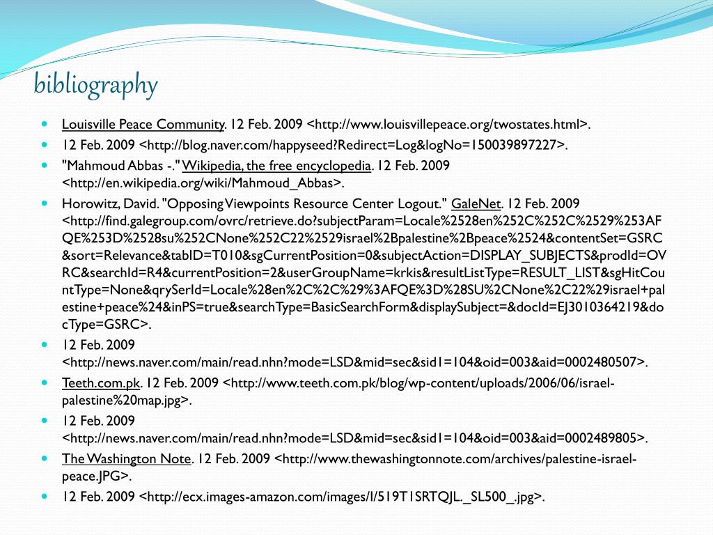 bibliography • Louisville Peace Community. 12 Feb. 2009 <http://www.louisvillepeace.org/twostates.html>. • 12 Feb. 2009 <http://blog.naver.com/happyseed?Redirect=Log&logNo=150039897227>. • "MahmoudAbbas -." Wikipedia, the free encyclopedia. 12 Feb. 2009 <http://en.wikipedia.org/wiki/Mahmoud_Abbas>. • Horowitz, David. "Opposing Viewpoints Resource Center Logout." GaleNet. 12 Feb. 2009 <http://find.galegroup.com/ovrc/retrieve.do?subjectParam=Locale%2528en%252C%252C%2529%253AFQE%253D%2528su%252CNone%252C22%2529israel%2Bpalestine%2Bpeace%2524&contentSet=GSRC&sort=Relevance&tabID=T010&sgCurrentPosition=0&subjectAction=DISPLAY_SUBJECTS&prodId=OVRC&searchId=R4¤tPosition=2&userGroupName=krkis&resultListType=RESULT_LIST&sgHitCountType=None&qrySerId=Locale%28en%2C%2C%29%3AFQE%3D%28SU%2CNone%2C22%29israel+palestine+peace%24&inPS=true&searchType=BasicSearchForm&displaySubject=&docId=EJ3010364219&docType=GSRC>. • 12 Feb. 2009 <http://news.naver.com/main/read.nhn?mode=LSD&mid=sec&sid1=104&oid=003&aid=0002480507>. • Teeth.com.pk. 12 Feb. 2009 <http://www.teeth.com.pk/blog/wp-content/uploads/2006/06/israel-palestine%20map.jpg>. • 12 Feb. 2009 <http://news.naver.com/main/read.nhn?mode=LSD&mid=sec&sid1=104&oid=003&aid=0002489805>. • The Washington Note. 12 Feb. 2009 <http://www.thewashingtonnote.com/archives/palestine-israel-peace.JPG>. • 12 Feb. 2009 <http://ecx.images-amazon.com/images/I/519T1SRTQJL._SL500_.jpg>.