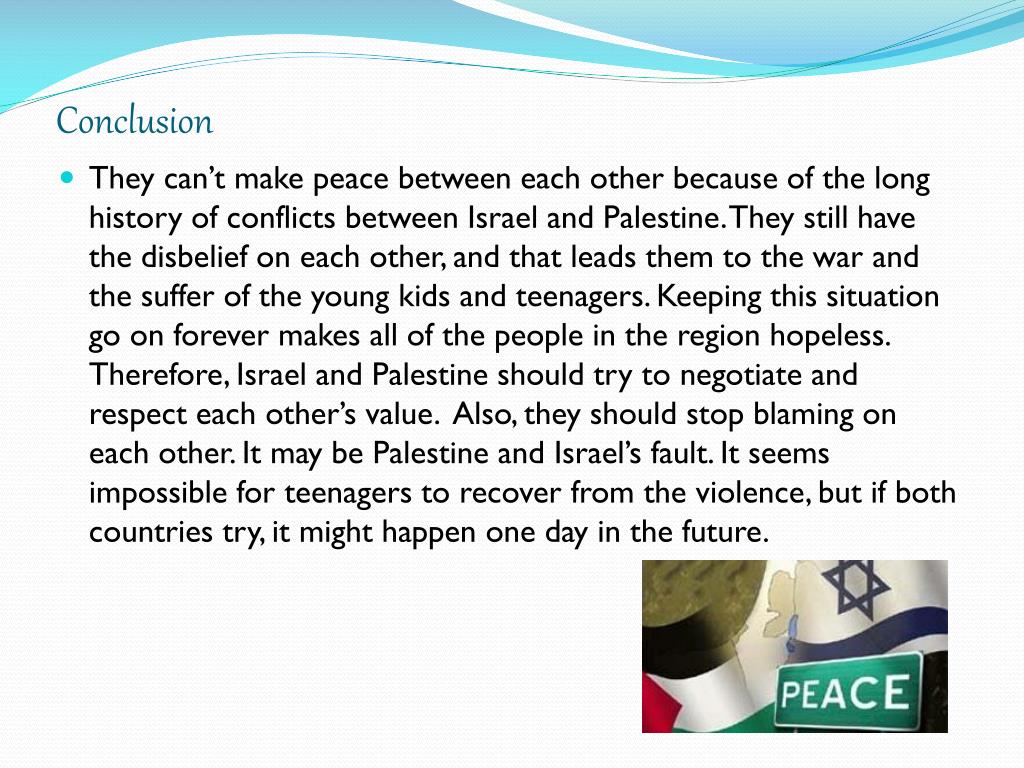 Conclusion • They can’t make peace between each other because of the long history of conflicts between Israel and Palestine. They still have the disbelief on each other, and that leads them to the war and the suffer of the young kids and teenagers. Keeping this situation go on forever makes all of the people in the region hopeless. Therefore, Israel and Palestine should try to negotiate and respect each other’s value. Also, they should stop blaming on each other. It may be Palestine and Israel’s fault. It seems impossible for teenagers to recover from the violence, but if both countries try, it might happen one day in the future.