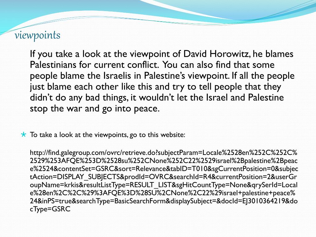 viewpoints If you take a look at the viewpoint of David Horowitz, he blames Palestinians for current conflict. You can also find that some people blame the Israelis in Palestine’s viewpoint. If all the people just blame each other like this and try to tell people that they didn’t do any bad things, it wouldn’t let the Israel and Palestine stop the war and go into peace. • To take a look at the viewpoints, go to this website: http://find.galegroup.com/ovrc/retrieve.do?subjectParam=Locale%2528en%252C%252C%2529%253AFQE%253D%2528su%252CNone%252C22%2529israel%2Bpalestine%2Bpeace%2524&contentSet=GSRC&sort=Relevance&tabID=T010&sgCurrentPosition=0&subjectAction=DISPLAY_SUBJECTS&prodId=OVRC&searchId=R4¤tPosition=2&userGroupName=krkis&resultListType=RESULT_LIST&sgHitCountType=None&qrySerId=Locale%28en%2C%2C%29%3AFQE%3D%28SU%2CNone%2C22%29israel+palestine+peace%24&inPS=true&searchType=BasicSearchForm&displaySubject=&docId=EJ3010364219&docType=GSRC