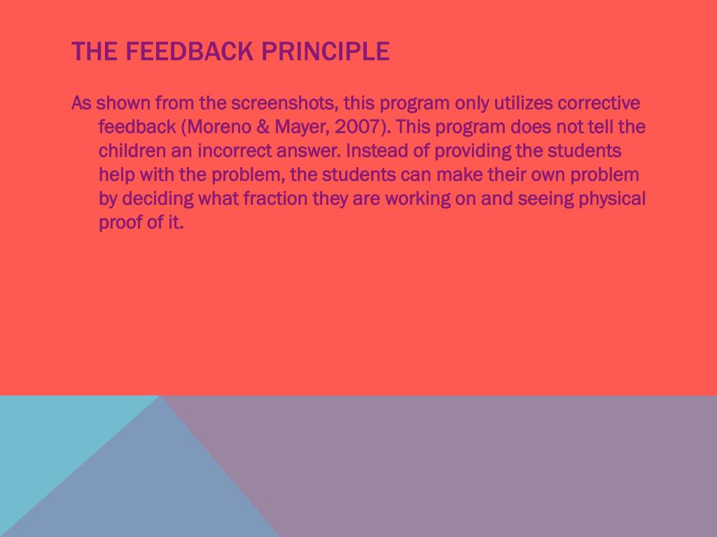 The Feedback Principle • As shown from the screenshots, this program only utilizes corrective feedback (Moreno & Mayer, 2007). This program does not tell the children an incorrect answer. Instead of providing the students help with the problem, the students can make their own problem by deciding what fraction they are working on and seeing physical proof of it.