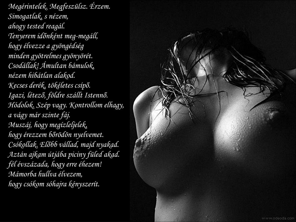 Megérintelek. Megfeszülsz. Érzem. Simogatlak, s nézem, ahogy tested reagál. Tenyerem időnként meg-megáll, hogy élvezze a gyöngédségminden gyötrelmes gyönyörét.Csodállak! Ámultan bámulok,nézem hibátlan alakod. Kecses derék, tökéletes csípő.Igazi, létező, földre szállt Istennő. Hódolok. Szép vagy. Kontrollom elhagy, a vágy már szinte fáj.Muszáj, hogy megízleljelek, hogy érezzem bőrödön nyelvemet.Csókollak. Előbb vállad, majd nyakad. Aztán ajkam útjába piciny füled akad.fél évszázada, hogy erre éhezem! Mámorba hullva élvezem,hogy csókom sóhajra kényszerít.