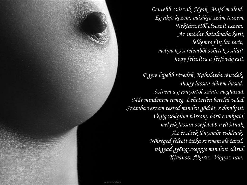 Lentebb csúszok. Nyak. Majd melleid. Egyikre kezem, másikra szám teszem.Nektárízétől elveszít eszem, Az imádat hatalmába kerít,lelkemre fátylat terít, melynek szerelemből szőtték szálait,hogy felszítsa a férfi vágyait.Egyre lejjebb tévedek. Kábulatba révedek, ahogy lassan elérem hasad. Szívem a gyönyörtől szinte meghasad.Már mindenem remeg. Lehetetlen betelni veled.Számba veszem tested minden gödrét, s dombjait.Végigcsókolom bársony bőrű combjaid,melyek lassan széjjelebb nyitódnak.Az érzések lényembe ivódnak. Nőiséged féltett titka szemem elé tárul, vágyad gyöngycseppje mindent elárul.Kívánsz. Akarsz. Vágysz rám.
