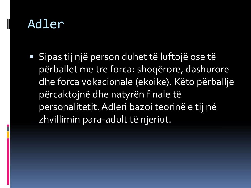 Adler • Sipas tij një person duhet të luftojë ose të përballet me tre forca: shoqërore, dashurore dhe forca vokacionale (ekoike). Këto përballje përcaktojnë dhe natyrën finale të personalitetit. Adleri bazoi teorinë e tij në zhvillimin para-adult të njeriut.