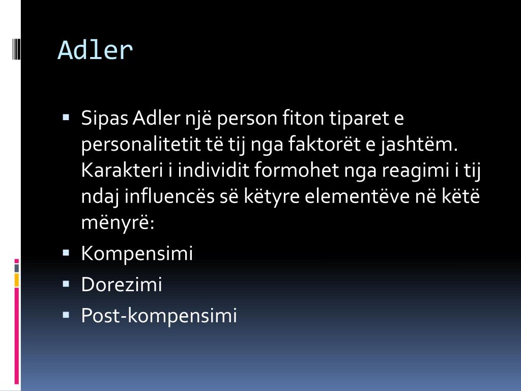 Adler • Sipas Adler një person fiton tiparet e personalitetit të tij nga faktorët e jashtëm. Karakteri i individit formohet nga reagimi i tij ndaj influencës së këtyre elementëve në këtë mënyrë: • Kompensimi • Dorezimi • Post-kompensimi