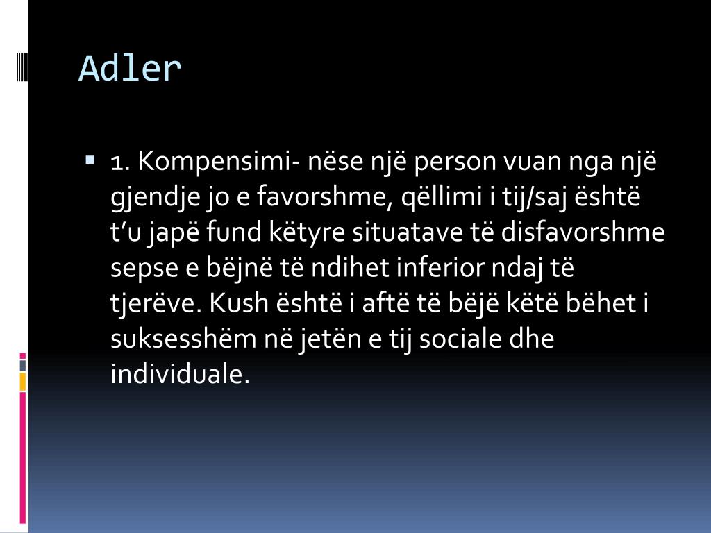 Adler • 1. Kompensimi- nëse një person vuan nga një gjendje jo e favorshme, qëllimi i tij/saj është t’u japë fund këtyre situatave të disfavorshme sepse e bëjnë të ndihet inferior ndaj të tjerëve. Kush është i aftë të bëjë këtë bëhet i suksesshëm në jetën e tij sociale dhe individuale.