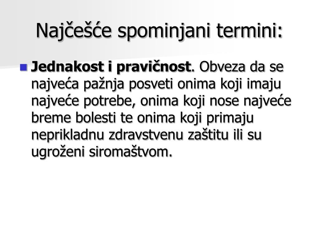 Najčešće spominjani termini: • Jednakost i pravičnost. Obveza da se najveća pažnja posveti onima koji imaju najveće potrebe, onima koji nose najveće breme bolesti te onima koji primaju neprikladnu zdravstvenu zaštitu ili su ugroženi siromaštvom.