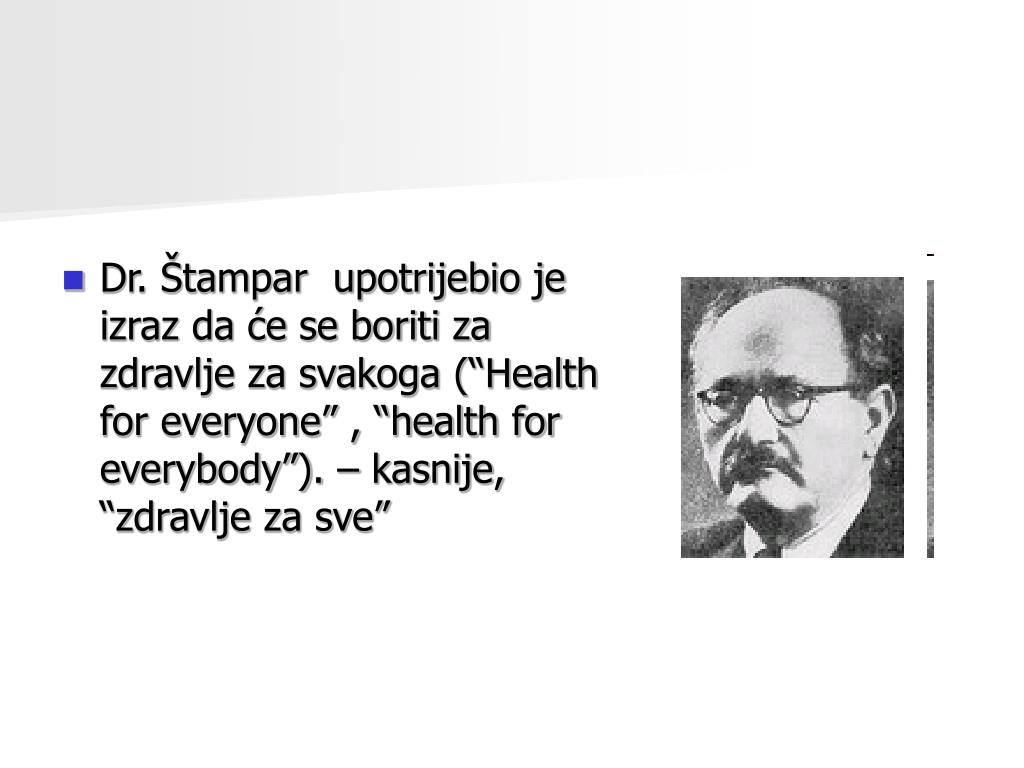 Dr. Štampar upotrijebio je izraz da će se boriti za zdravlje za svakoga (“Health for everyone” , “health for everybody”).– kasnije, “zdravlje za sve”
