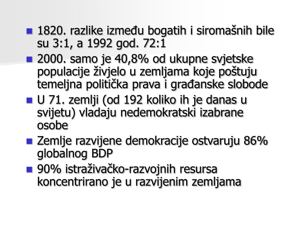 1820. razlike između bogatih i siromašnih bile su 3:1, a 1992 god. 72:1 • 2000. samo je 40,8% od ukupne svjetske populacije živjelo u zemljama koje poštuju temeljna politička prava i građanske slobode • U 71. zemlji (od 192 koliko ih je danas u svijetu) vladaju nedemokratski izabrane osobe • Zemlje razvijene demokracije ostvaruju 86% globalnog BDP • 90% istraživačko-razvojnih resursa koncentrirano je u razvijenim zemljama