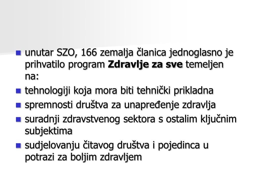 unutar SZO, 166 zemalja članica jednoglasno je prihvatilo program Zdravlje za sve temeljen na: • tehnologiji koja mora biti tehnički prikladna • spremnosti društva za unapređenje zdravlja • suradnji zdravstvenog sektora s ostalim ključnim subjektima • sudjelovanju čitavog društva i pojedinca u potrazi za boljim zdravljem
