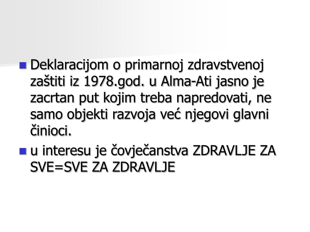 Deklaracijom o primarnoj zdravstvenoj zaštiti iz 1978.god. u Alma-Ati jasno je zacrtan put kojim treba napredovati, ne samo objekti razvoja već njegovi glavni činioci. • u interesu je čovječanstva ZDRAVLJE ZA SVE=SVE ZA ZDRAVLJE