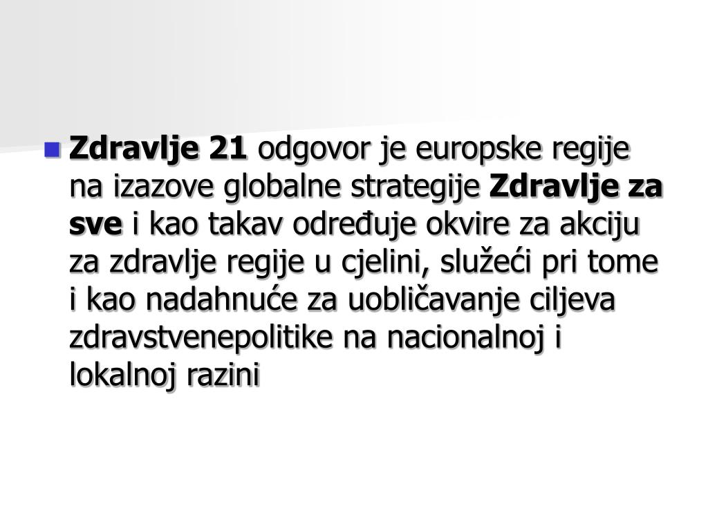 Zdravlje 21 odgovor je europske regije na izazove globalne strategije Zdravlje za sve i kao takav određuje okvire za akciju za zdravlje regije u cjelini, služeći pri tome i kao nadahnuće za uobličavanje ciljeva zdravstvenepolitike na nacionalnoj i lokalnoj razini