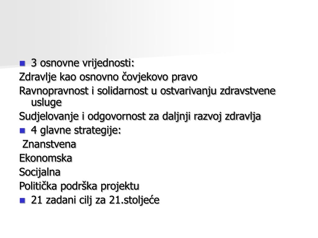 3 osnovne vrijednosti: Zdravlje kao osnovno čovjekovo pravo Ravnopravnost i solidarnost u ostvarivanju zdravstvene usluge Sudjelovanje i odgovornost za daljnji razvoj zdravlja • 4 glavne strategije: Znanstvena Ekonomska Socijalna Politička podrška projektu • 21 zadani cilj za 21.stoljeće