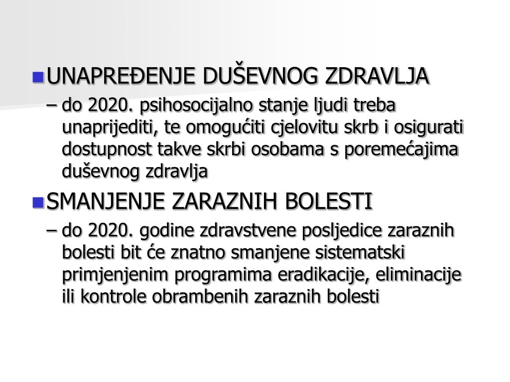 UNAPREĐENJE DUŠEVNOG ZDRAVLJA • do 2020. psihosocijalno stanje ljudi treba unaprijediti, te omogućiti cjelovitu skrb i osigurati dostupnost takve skrbi osobama s poremećajima duševnog zdravlja • SMANJENJE ZARAZNIH BOLESTI • do 2020. godine zdravstvene posljedice zaraznih bolesti bit će znatno smanjene sistematski primjenjenim programima eradikacije, eliminacije ili kontrole obrambenih zaraznih bolesti