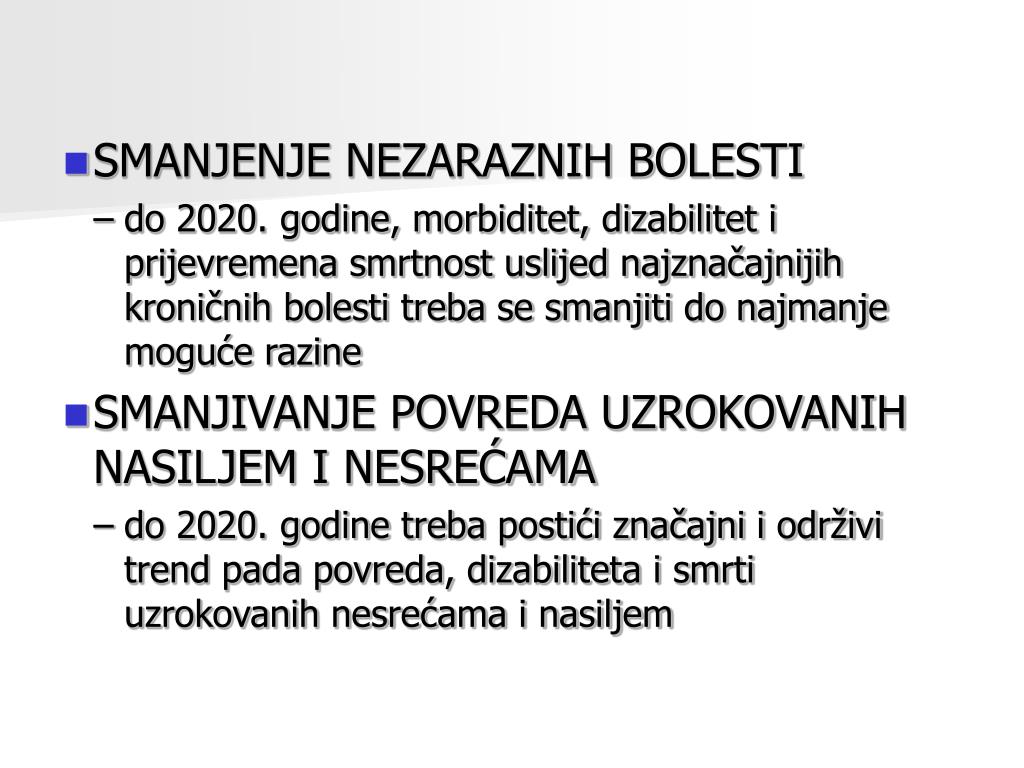 SMANJENJE NEZARAZNIH BOLESTI • do 2020. godine, morbiditet, dizabilitet i prijevremena smrtnost uslijed najznačajnijih kroničnih bolesti treba se smanjiti do najmanje moguće razine • SMANJIVANJE POVREDA UZROKOVANIH NASILJEM I NESREĆAMA • do 2020. godine treba postići značajni i održivi trend pada povreda, dizabiliteta i smrti uzrokovanih nesrećama i nasiljem