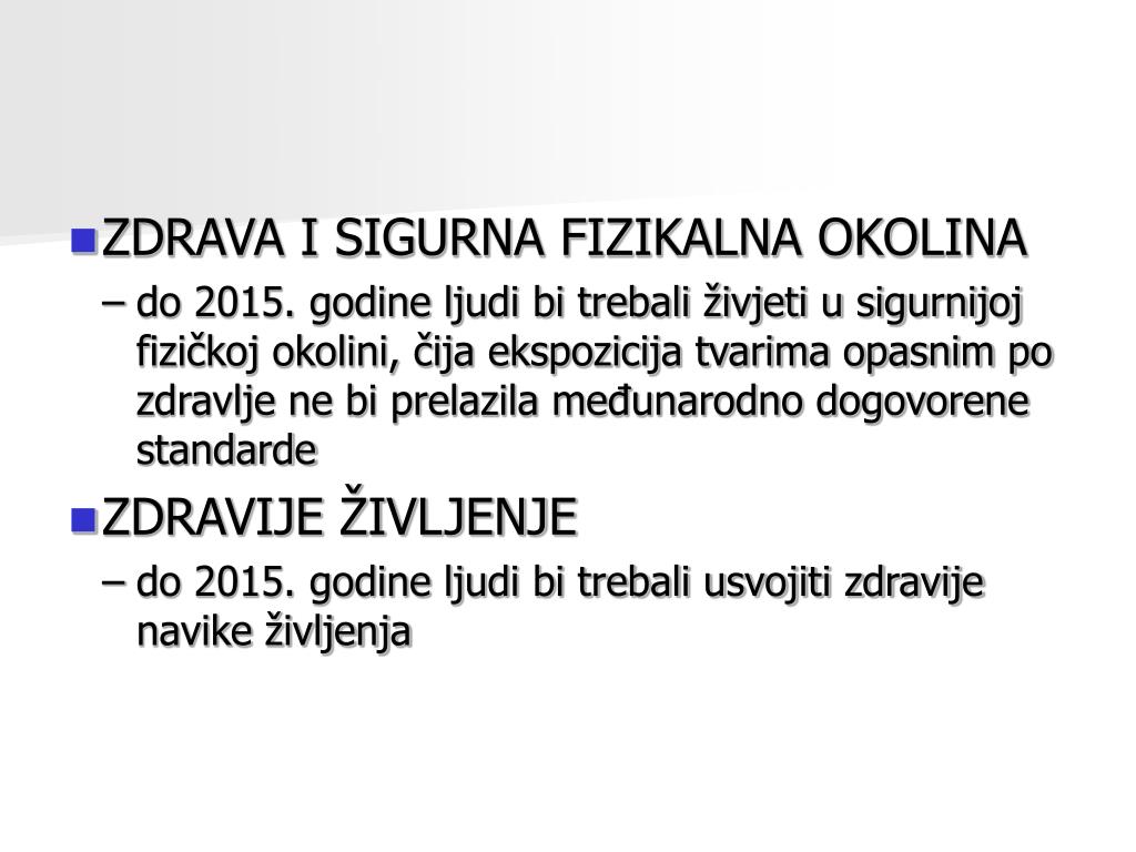 ZDRAVA I SIGURNA FIZIKALNA OKOLINA • do 2015. godine ljudi bi trebali živjeti u sigurnijoj fizičkoj okolini, čija ekspozicija tvarima opasnim po zdravlje ne bi prelazila međunarodno dogovorene standarde • ZDRAVIJE ŽIVLJENJE • do 2015. godine ljudi bi trebali usvojiti zdravije navike življenja