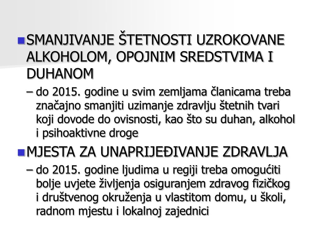 SMANJIVANJE ŠTETNOSTI UZROKOVANE ALKOHOLOM, OPOJNIM SREDSTVIMA I DUHANOM • do 2015. godine u svim zemljama članicama treba značajno smanjiti uzimanje zdravlju štetnih tvari koji dovode do ovisnosti, kao što su duhan, alkohol i psihoaktivne droge • MJESTA ZA UNAPRIJEĐIVANJE ZDRAVLJA • do 2015. godine ljudima u regiji treba omogućiti bolje uvjete življenja osiguranjem zdravog fizičkog i društvenog okruženja u vlastitom domu, u školi, radnom mjestu i lokalnoj zajednici
