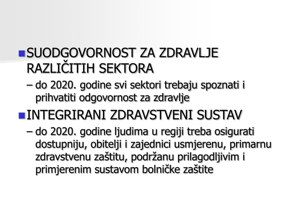 SUODGOVORNOST ZA ZDRAVLJE RAZLIČITIH SEKTORA • do 2020. godine svi sektori trebaju spoznati i prihvatiti odgovornost za zdravlje • INTEGRIRANI ZDRAVSTVENI SUSTAV • do 2020. godine ljudima u regiji treba osigurati dostupniju, obitelji i zajednici usmjerenu, primarnu zdravstvenu zaštitu, podržanu prilagodljivim i primjerenim sustavom bolničke zaštite