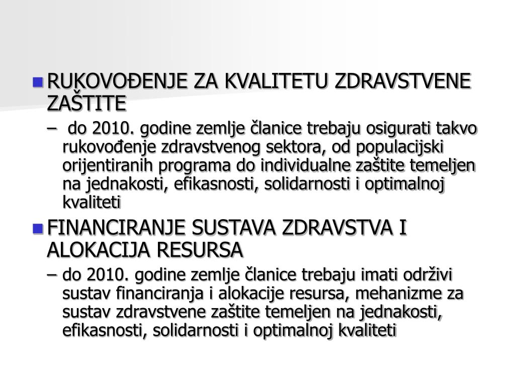 RUKOVOĐENJE ZA KVALITETU ZDRAVSTVENE ZAŠTITE • do 2010. godine zemlje članice trebaju osigurati takvo rukovođenje zdravstvenog sektora, od populacijski orijentiranih programa do individualne zaštite temeljen na jednakosti, efikasnosti, solidarnosti i optimalnoj kvaliteti • FINANCIRANJE SUSTAVA ZDRAVSTVA I ALOKACIJA RESURSA • do 2010. godine zemlje članice trebaju imati održivi sustav financiranja i alokacije resursa, mehanizme za sustav zdravstvene zaštite temeljen na jednakosti, efikasnosti, solidarnosti i optimalnoj kvaliteti