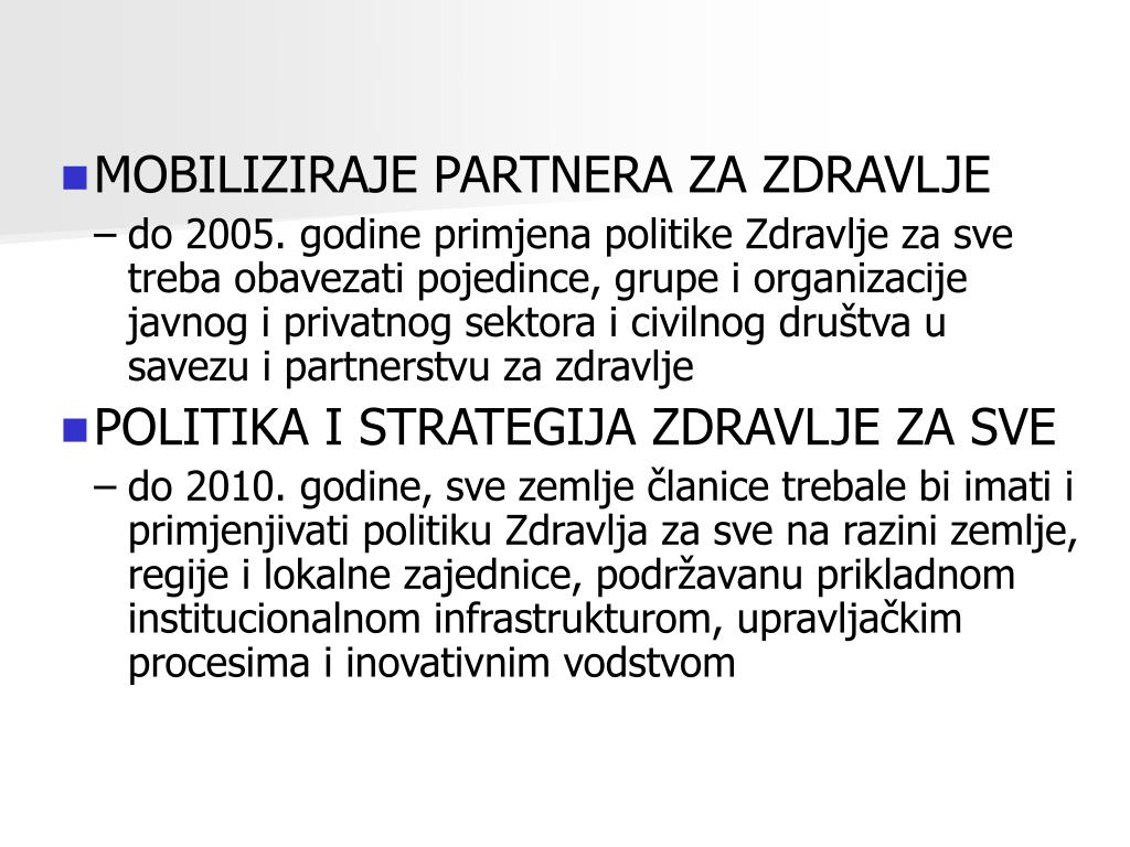 MOBILIZIRAJE PARTNERA ZA ZDRAVLJE • do 2005. godine primjena politike Zdravlje za sve treba obavezati pojedince, grupe i organizacije javnog i privatnog sektora i civilnog društva u savezu i partnerstvu za zdravlje • POLITIKA I STRATEGIJA ZDRAVLJE ZA SVE • do 2010. godine, sve zemlje članice trebale bi imati i primjenjivati politiku Zdravlja za sve na razini zemlje, regije i lokalne zajednice, podržavanu prikladnom institucionalnom infrastrukturom, upravljačkim procesima i inovativnim vodstvom