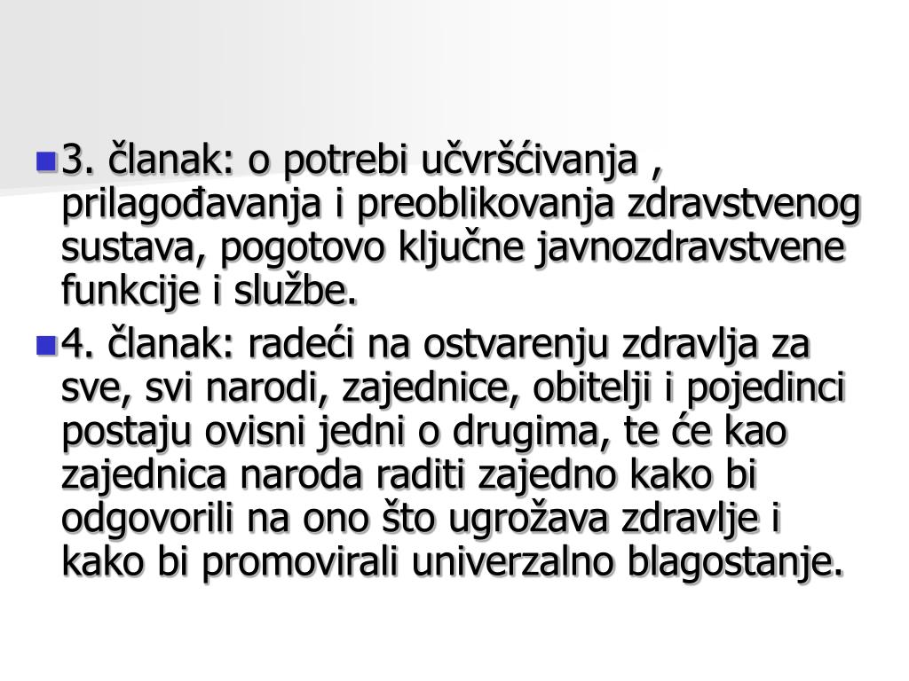 3. članak: o potrebi učvršćivanja , prilagođavanja i preoblikovanja zdravstvenog sustava, pogotovo ključne javnozdravstvene funkcije i službe. 4. članak: radeći na ostvarenju zdravlja za sve, svi narodi, zajednice, obitelji i pojedinci postaju ovisni jedni o drugima, te će kao zajednica naroda raditi zajedno kako bi odgovorili na ono što ugrožava zdravlje i kako bi promovirali univerzalno blagostanje.