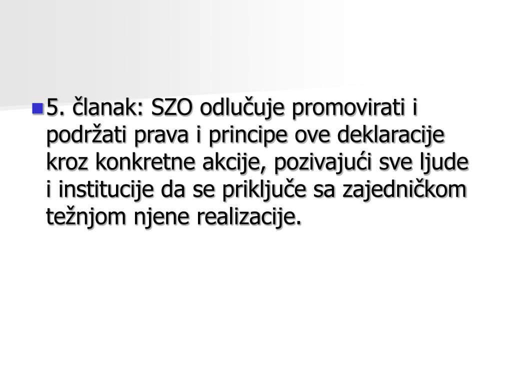 5. članak: SZO odlučuje promovirati i podržati prava i principe ove deklaracije kroz konkretne akcije, pozivajući sve ljude i institucije da se priključe sa zajedničkom težnjom njene realizacije.