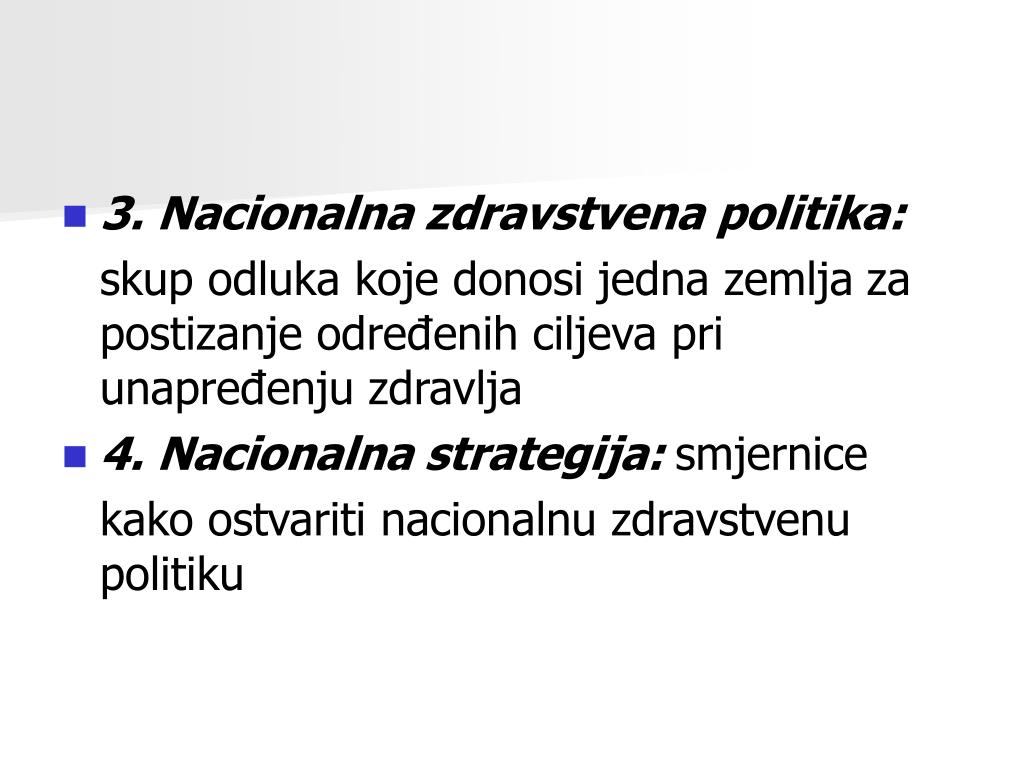3. Nacionalna zdravstvena politika: skup odluka koje donosi jedna zemljaza postizanje određenih ciljeva priunapređenju zdravlja • 4. Nacionalna strategija: smjernice kako ostvariti nacionalnu zdravstvenupolitiku