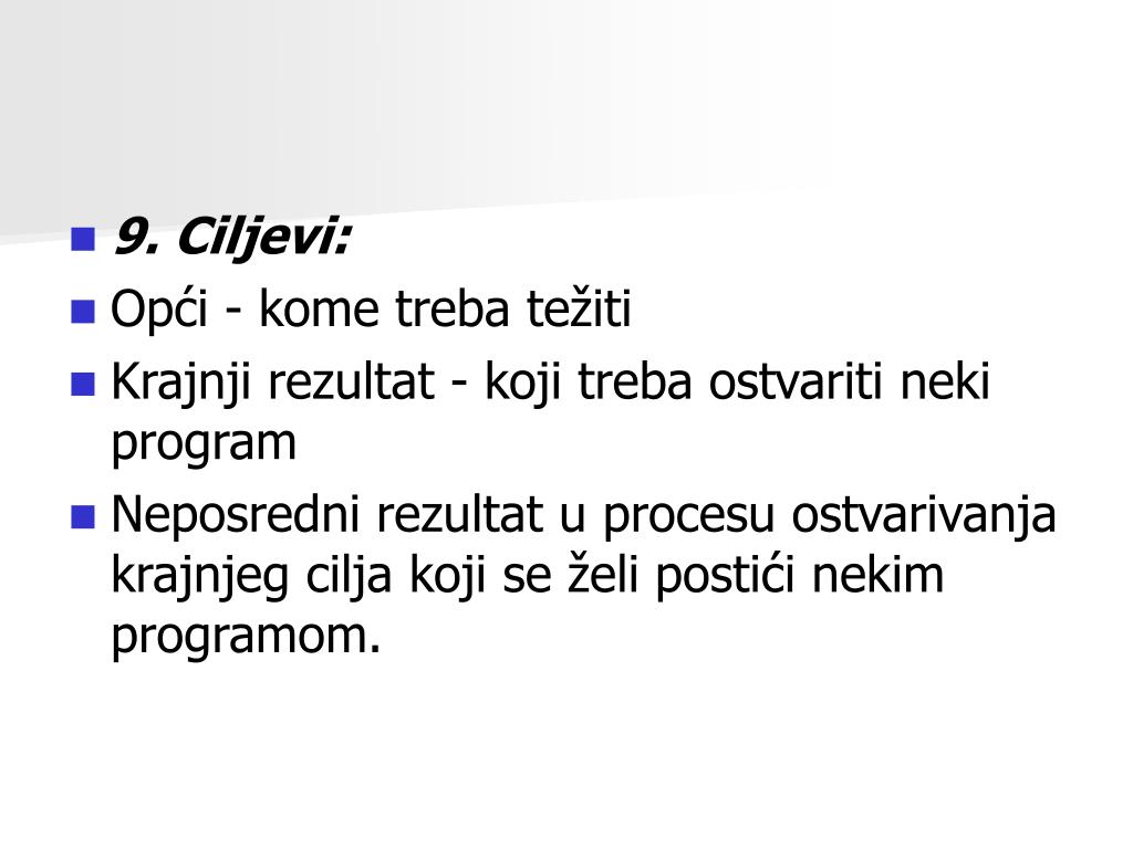 9. Ciljevi: • Opći - kometreba težiti • Krajnjirezultat - koji treba ostvariti nekiprogram • Neposrednirezultatu procesuostvarivanja krajnjeg cilja koji se želipostići nekim programom.