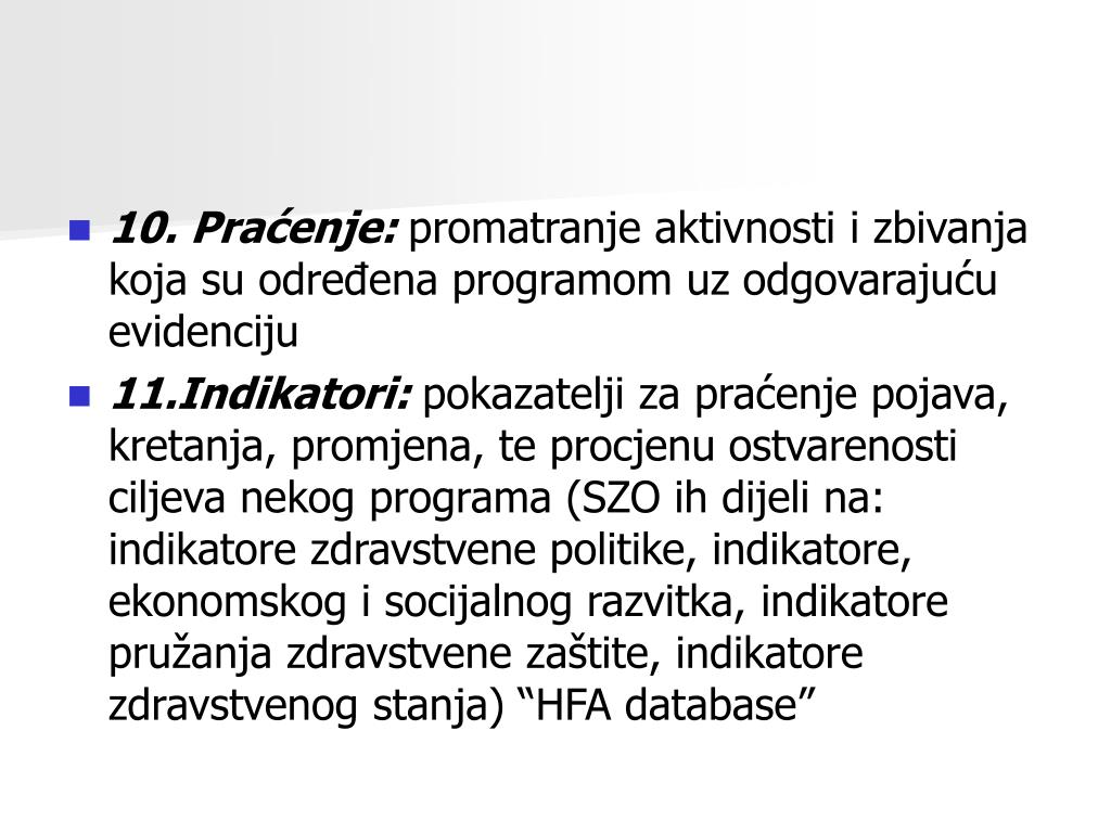 10. Praćenje: promatranje aktivnosti i zbivanja koja su određena programom uzodgovarajuću evidenciju • 11.Indikatori: pokazatelji za praćenjepojava, kretanja, promjena, te procjenuostvarenosti ciljeva nekog programa(SZO ih dijeli na: indikatore zdravstvenepolitike, indikatore, ekonomskog i socijalnog razvitka, indikatore pružanjazdravstvene zaštite, indikatorezdravstvenog stanja) “HFA database”