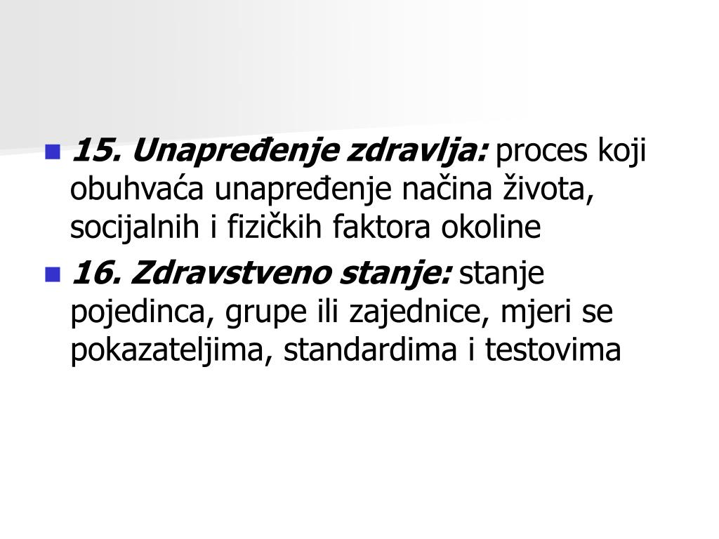 15. Unapređenje zdravlja: proces kojiobuhvaća unapređenje načina života,socijalnih i fizičkih faktora okoline • 16. Zdravstveno stanje: stanjepojedinca, grupe ili zajednice, mjeri sepokazateljima, standardima i testovima