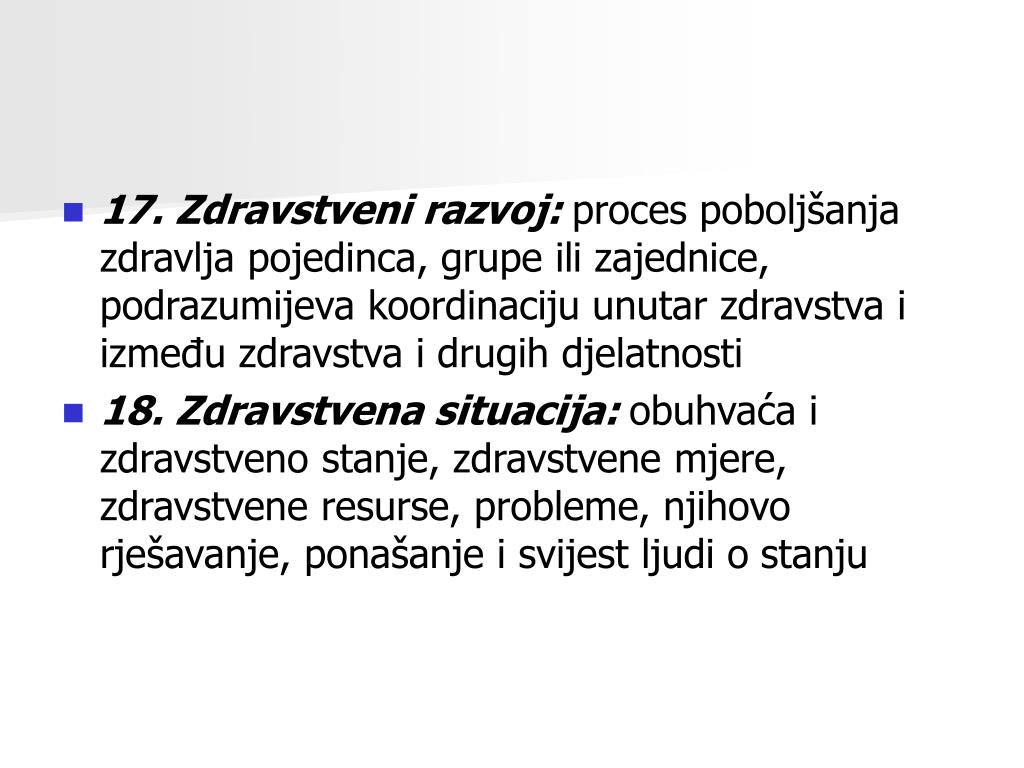 17. Zdravstveni razvoj: procespoboljšanja zdravlja pojedinca, grupe ili zajednice, podrazumijeva koordinacijuunutar zdravstva i između zdravstva i drugih djelatnosti • 18. Zdravstvena situacija: obuhvaća i zdravstveno stanje, zdravstvene mjere,zdravstvene resurse, probleme, njihovorješavanje, ponašanje i svijest ljudi ostanju