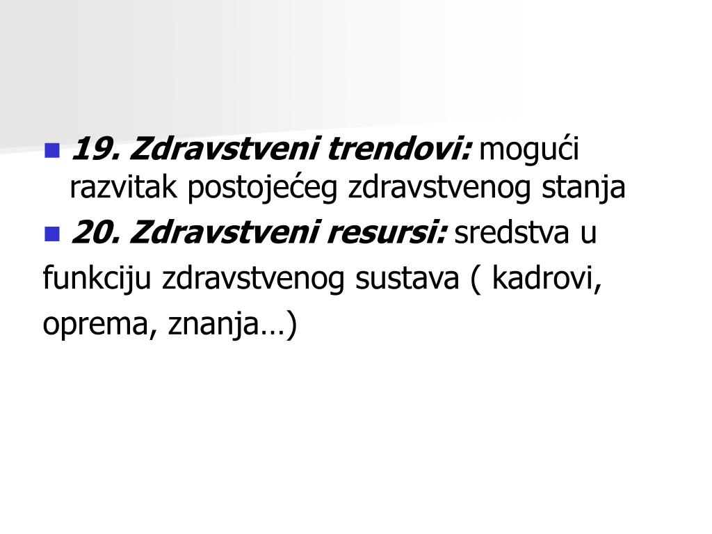 19. Zdravstveni trendovi: mogućirazvitak postojećeg zdravstvenog stanja • 20. Zdravstveni resursi: sredstva u funkciju zdravstvenog sustava ( kadrovi, oprema, znanja…)