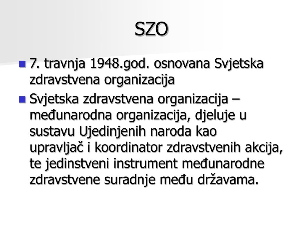 SZO • 7. travnja 1948.god. osnovana Svjetska zdravstvena organizacija • Svjetska zdravstvena organizacija – međunarodna organizacija, djeluje u sustavu Ujedinjenih naroda kao upravljač i koordinator zdravstvenih akcija, te jedinstveni instrument međunarodne zdravstvene suradnje među državama.