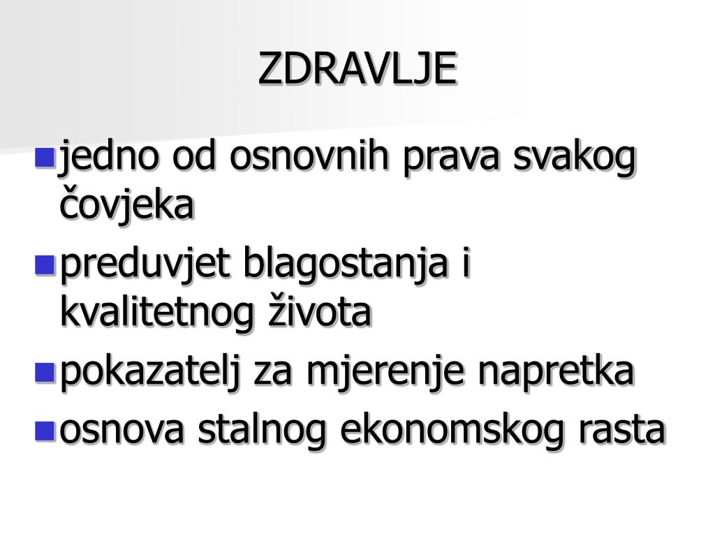 ZDRAVLJE • jedno od osnovnih prava svakog čovjeka • preduvjet blagostanja i kvalitetnog života • pokazatelj za mjerenje napretka • osnova stalnog ekonomskog rasta